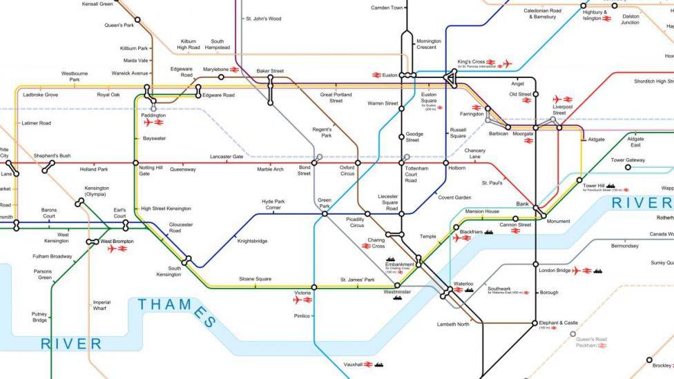 Zone 1 Kart over undergrunnslinjene i den indre bykjernen av London. Kallenavnet «tube» kommer fra den nærmest sirkelrunde formen på tunnellene de kjører gjennom. Foto: WIKICOMMONS