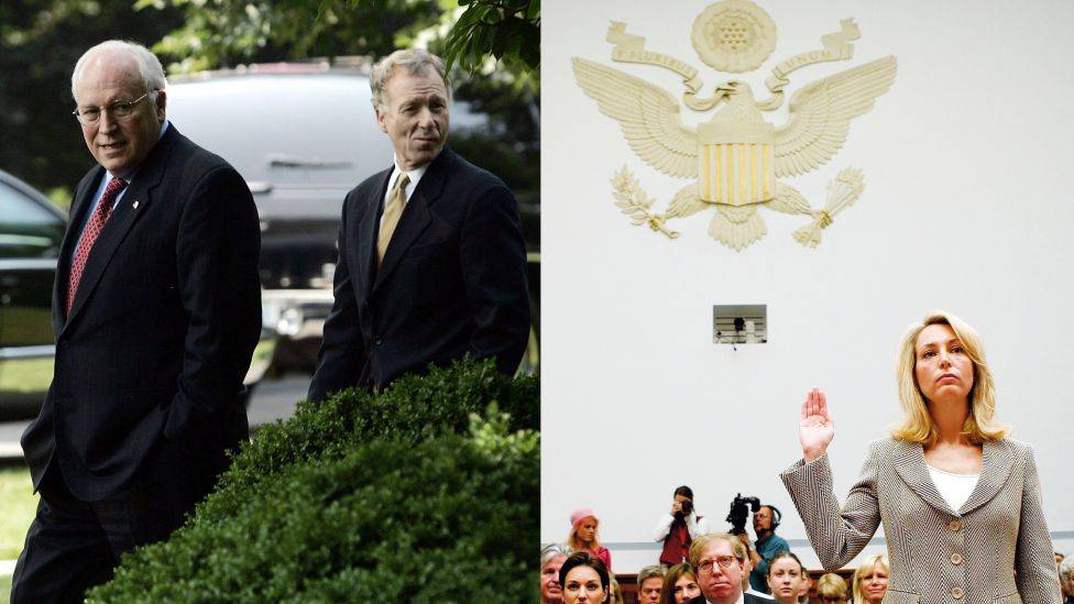 Sveket av staten hun jobbet for USAs visepresident Dick Cheney (t.v.) ble avbildet sammen med rådgiver I. Lewis «Scooter» Libby 7. juli 2005, kort tid før George W. Bush gikk hardt ut mot de ansvarlige for lekkasjen. 16. mars 2007 vitnet tidliger...