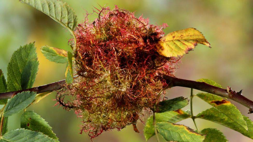 Hybelhus i rosebusken. Det er den lille rosegallvepsen (Diplolepis rosae) som legger eggene sine i knopper på ville rosebusker. Styrt av kjemisk påvirkning fra insektet utvikler knoppen seg til en rund ball. Slike «misdannelser» frembrakt av insekter og andre små organismer kalles galler.
