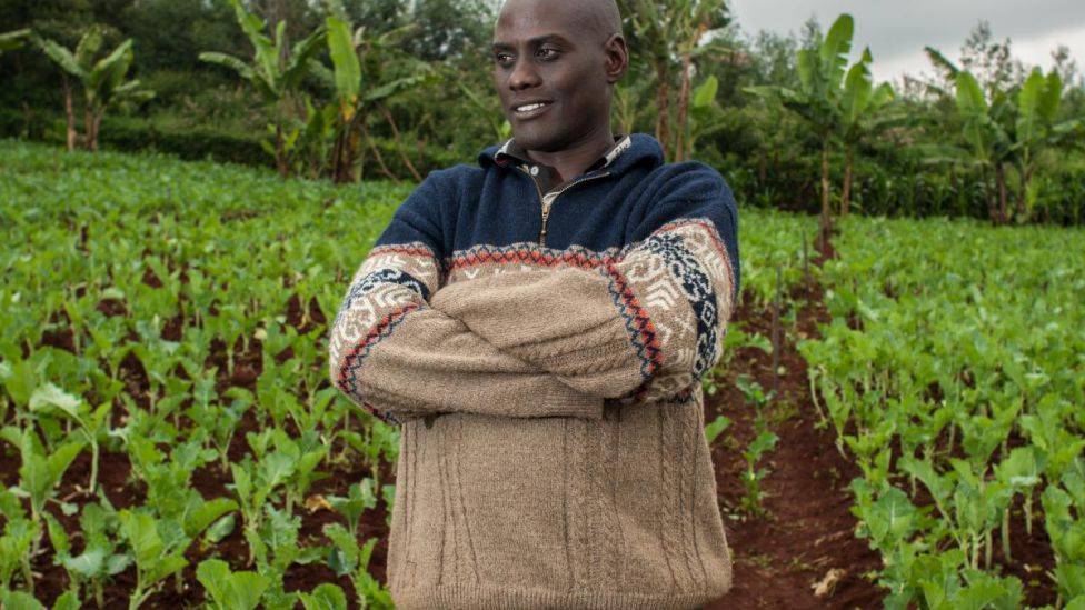 Tråpumpe. En times kjøretur utenfor Nairobi ligger landsbyen Uthiru. En gjørmete sti leder til en liten familiegård, og ute på jordet møter vi bonden Edward Kinyanjui (39), som driver gården med sin kone og tre barn.