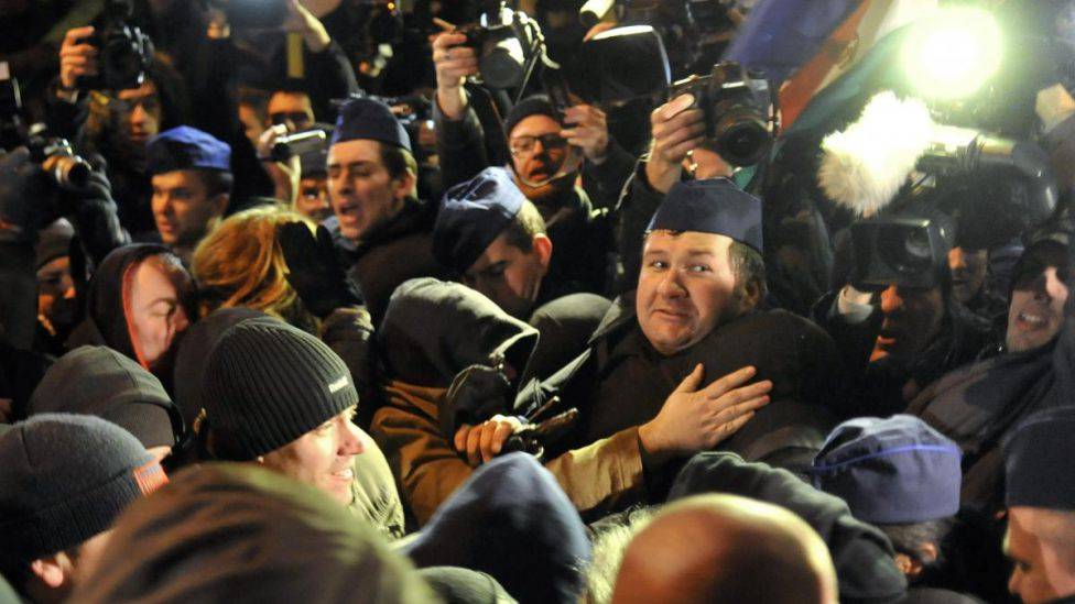 Ungarn Politi og høyreradikale demonstranter i slåsskamp i Budapest i februar i år. Politiet forsøkte å hindre dem i å nå en gruppe regjeringskritikere som protesterte mot utnevnelsen av en teaterdirektør som støtter nasjonalistpartiet Jobbi...