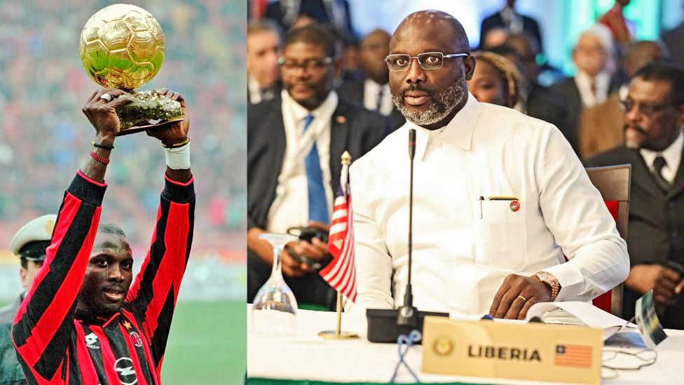 • Fotballikon ble president George Weah hever Gullballen 7. januar 1996, etter å ha blitt kåret til årets beste spiller i 1995 da han spilte for AC Milan. Weah vokste opp i et fattig nabolag i utkanten av hovedstaden Monrovia, slo seg opp som fotballspiller og ble valgt til president i Liberia i 2017 og innsatt i januar 2018. Foto: CARLO FURNAGALLI/AP og KOLA SULAIMON/AFP/NTB SCANPIX