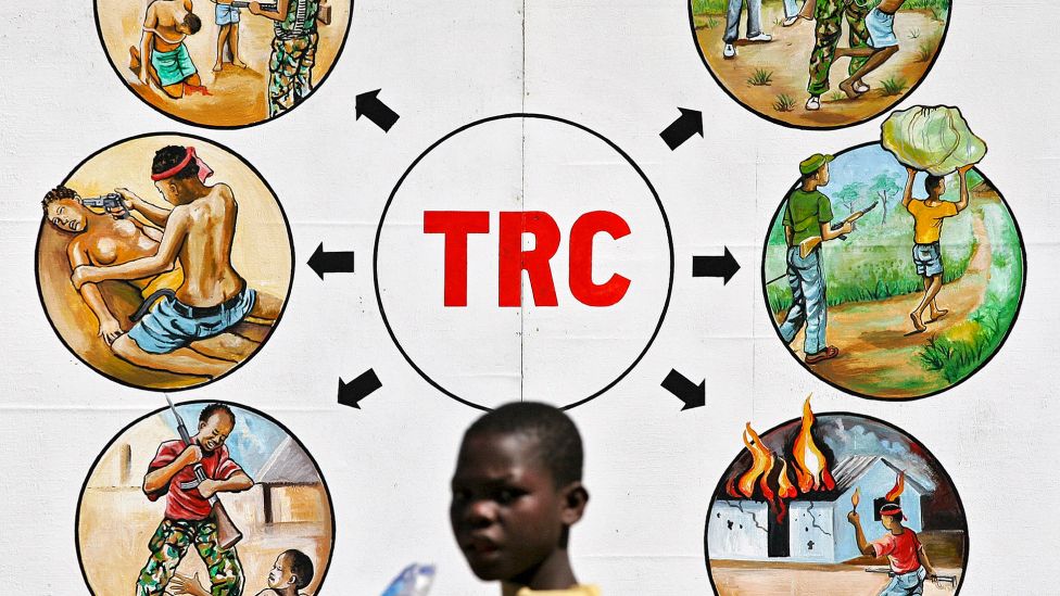 • Ønske om å gå videre En gutt går forbi en illustrasjon av det som førte til opprettelsen av Liberias Truth and Reconciliation Commission. Landet vedtok etter borgerkrigen ikke å opprette en krigsforbryterdomstol, men i stedet arbeide for en forsoningsprosess, med en kommisjon hvor ofre får fortelle sin historie, men som ikke har myndighet til å dømme forbrytere. Mange uttrykker en lettelse over at Charles Taylor ble dømt for sine forbrytelser i nabolandet, mens enda flere har ytret et ønske om at de bare ønsker å legge det bak seg og gå videre. Ellen Johnson Sirleaf har fått kritikk for aldri å ta et skikkelig oppgjør med den blodige fortiden. Foto: REBECCA BLACKWELL/AP/NTB SCANPIX