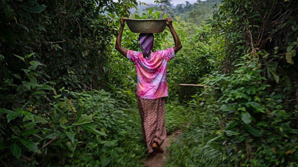 Manso Krofrom, Ghana. Med arbeidsredskapene i et blikkfat på hodet glir Akua Fokuo frem langs de smale stiene utenfor byen Manso Krofrom i Ashanti-regionen i innlandet av Ghana. Gjennom høyt gress, forbi kolleger som hilser muntert, og nedover glatte små skråninger, til hun kommer frem til avlingen sin.