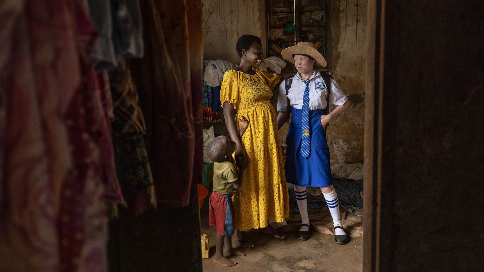Samfunnsstøtte Peter Ogik, leder for organisasjonen The Source of the Nile Union of Persons with Albinism (SNUPA), er på besøk hos Rachel Nanangwe i hjemmet hennes i Jinja. Han drar ofte på slike besøk til folk i regionen for å gi støtte, informere og distribuere solkrem. SNUPA er den eneste organisasjonen i Uganda som importerer solkrem for folk med albinisme, og de hjelper folk i kampen mot hudkreft. Foto: Sofi Lundin