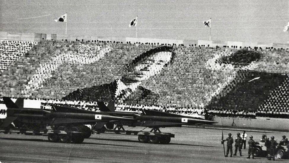 • Diktator Under militærparaden på Sør-Koreas dag for landets væpnede styrker 1. oktober 1973, ble den mektige presidenten Park Chung-hee æret med en enorm plakatmosaikk fra tribunene. Foto: WIKICOMMONS