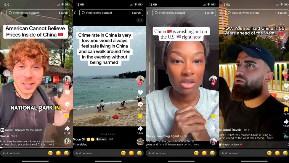 • Kina-glansbilde Vestlige influensere på Tiktok fremsnakker livet i Kina. Amerikaneren Christian Grossi (t.v.) har over 2 millioner følgere på Tiktok, der han blant annet jubler over prisnivået i Kina. Foto: Skjermbilder fra Tiktok