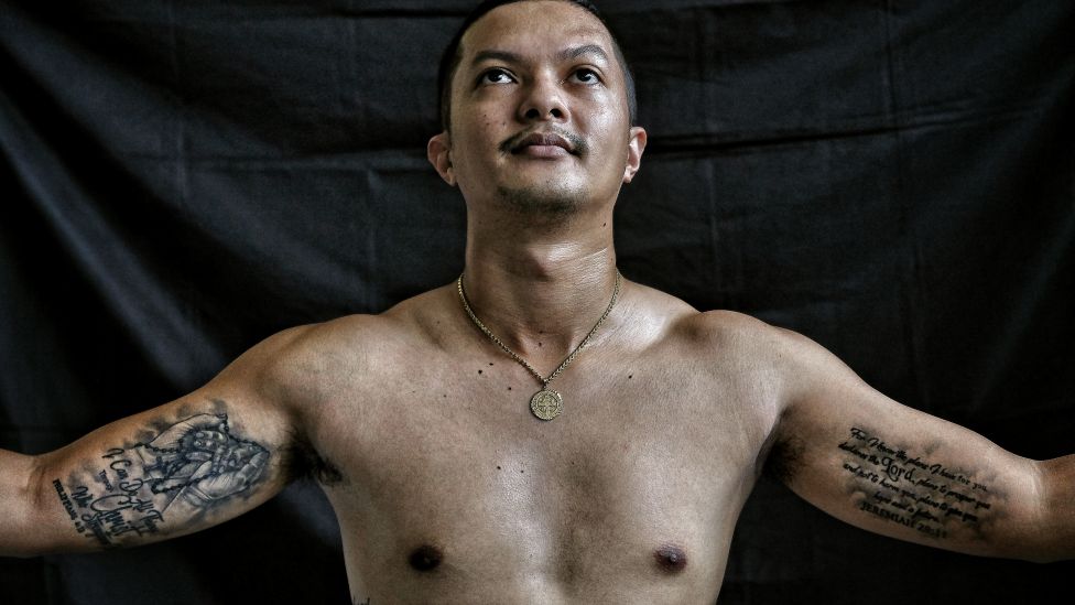 Han jobber som tatovør i Manila og har en korsfestet Kristus med enorme vinger som sprer seg over hele brystkassen hans.
