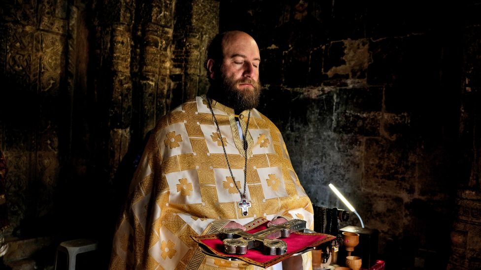 Om søndagene starter gudstjenestene tidlig. Kirkens porter åpner om morgenen, og kirkegjengerne kommer gående fra sine hus i landsbyen. Steinveggene inne i kirken er dekorert med ikoner og malerier, alle over tusen år gamle. Helt foran står det lille kirkekoret med fire kvinner i ulik alder. Fader Tornike bærer, i likhet med de andre av kirkens menn, en tung drakt dekorert med gullbroderier.
