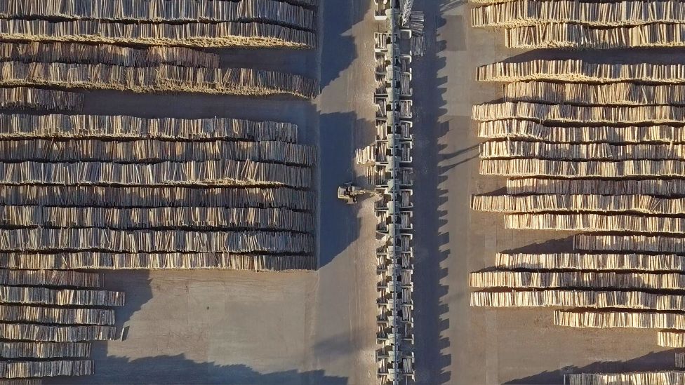 Gapende sår og tapt tømmer Fra dronenes fugleperspektiv kan man se de store hullene i den ellers tette skogen. Trærne ender opp som tømmer og pinneved ved treforedlingsbedrifter i inn- og utland. Foto: AGENT GREEN