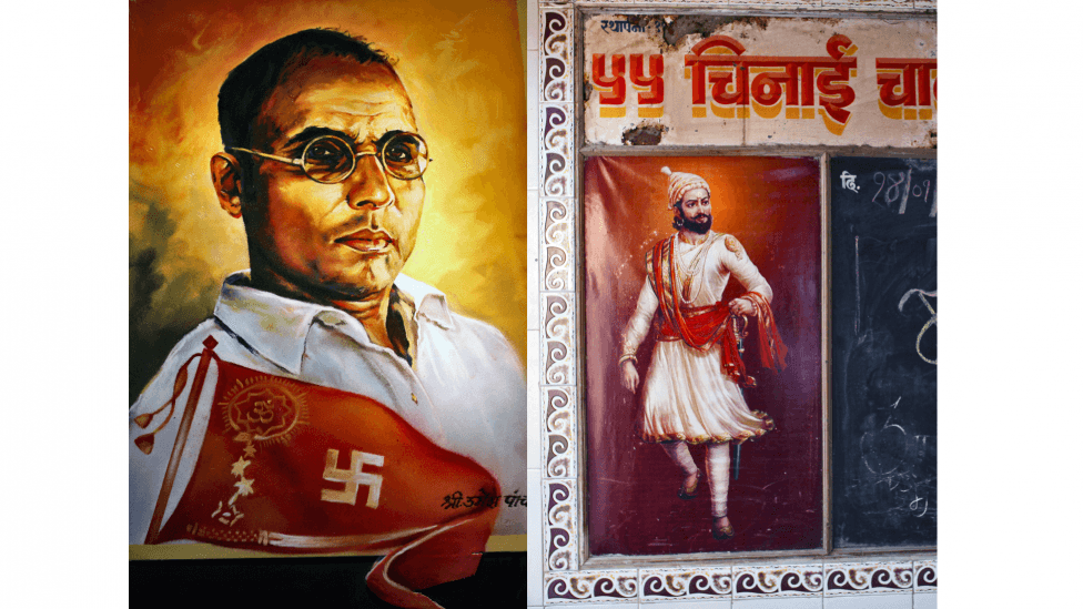 Hindunasjonalismens ideologiske gudfar Vinayak Damodar Savarkar (t.v.). Hindunasjonalisten og krigerkongen Shivaji Bhosales (t.h.) portrett sees overalt.