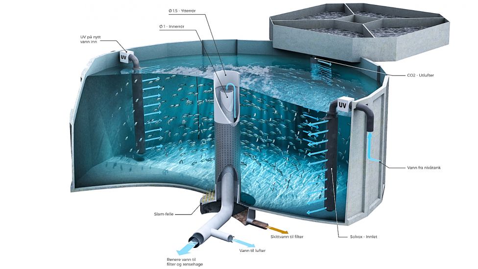 Selvrensende fisketanker Gründerne bak landbasert oppdrett mener de i langt større grad vil kunne ivareta fiskevelferd, biosikkerhet og logistikk enn ved oppdrett i åpne merder i fjordene. Det norske firmaet Nordic Aquafarms har investert store beløp i forskning og uttesting de siste par årene – basert på troen om at det er mulig å få til en miljøvennlig måte å øke produksjonen på. I desember setter selskapet i gang produksjon i Fredrikstad med en plan om å få frem slakteklar laks et år senere. Illustrasjon: Fra Nordic Aquafarms presentasjonsvideo, gjengitt med tillatelse.