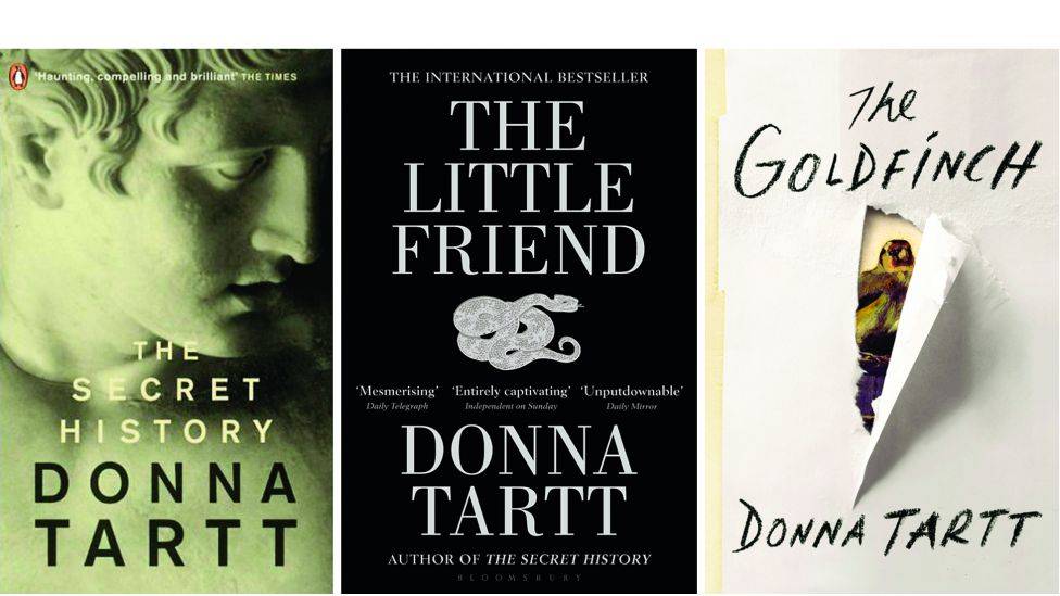 Fra venstre: «The secret history» («Den hemmelige historien») 1992, «The little friend» («Den lille vennen») 2002 og «The Goldfinch» («Stillitsen») 2013.