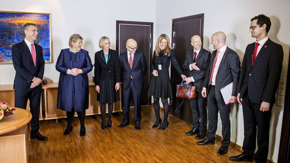 • Mer enn en veskebærer Det blir stadig flere statssekretærer, og de har ofte stor innflytelse. Erna Solbergs regjering har i dag 43 statssekretærer på 18 statsråder. Fra v. avtroppende statsminister Jens Stoltenberg (Ap), påtroppende statsminister Erna Solberg (H), regjeringsråd Nina Frisak, påtroppende statsråd Vidar Helgesen (H), og fire av de påtroppende statssekretærene ved Statsministerens kontor Julie Margrethe Brodtkorb (H), Lars Øy (H), Sigbjørn Aanes (H) og Fredrik Färber (Frp), 16. oktober 2013. Foto: VEGARD WIVESTAD GRØTT, NTB SCANPIX