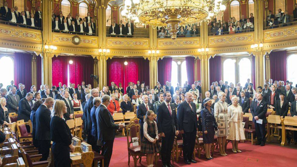 Jubileumsmøte på Stortinget 15. mai 2014: Kongefamilien på plass i Stortingssalen. Fra venstre: prinsesse Ingrid Alexandra, kronprins Haakon, kong Harald, dronning Sonja, kronprinsesse Mette-Marit og prinsesse Astrid, fru Ferner.