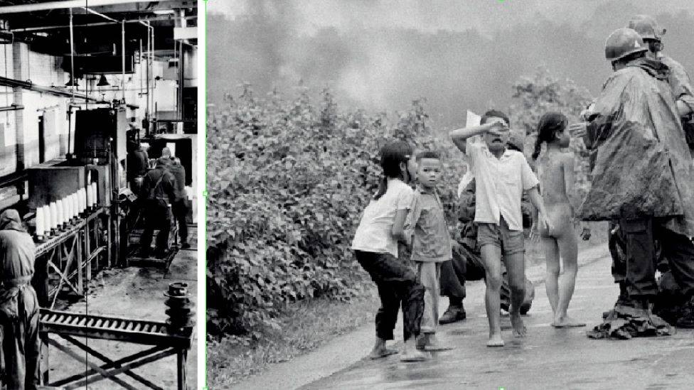 Rocky Mountain-produsert napalm Ni år gamle Kim Phuc (over t.h.) får hjelp av pressefolk i militære arbeidsuniformer, etter at et sørvietnamesisk fly slapp napalmbomber over det de trodde var en Vietcong-stilling i den sørvietnamesiske landsbyen...