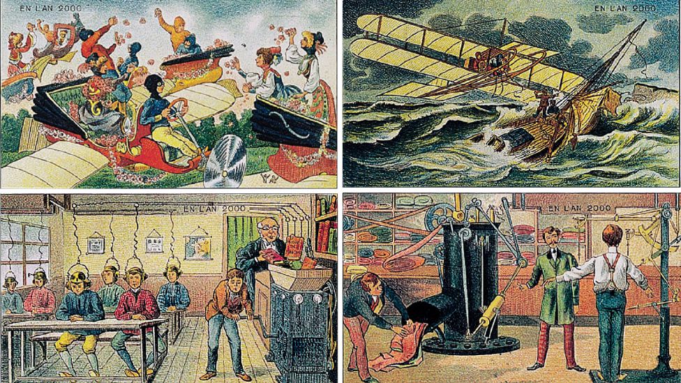 Allerede på 1800-tallet var det mange som så for seg både romreiser, biler og luftfart – men med klare viktorianske trekk. I H.C. Andersens eventyr «Om tusen år» fra 1853 lar for eksempel forfatteren amerikanere reise Europa rundt på åtte dager. Men de gjør det med luftskip, ikke fly, og kommuniserer med telegraf, ikke e-post eller SMS.