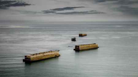 Restene etter de alliertes kunstige invasjonshavn Mulberry Harbour ses fremdeles langs franske strender.